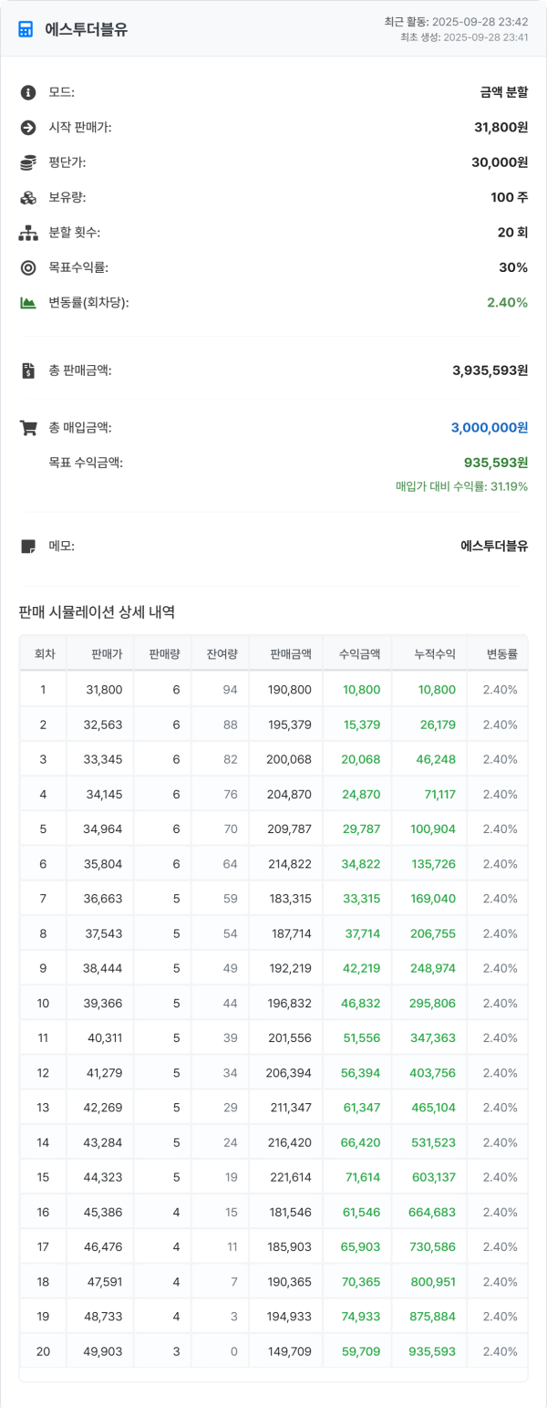 2.분할매도 계획을 체계적으로 세울 수 있어요: 막연하게 '올랐을 때 팔아야지' 하는 것보다 훨씬 구체적인 매도 계획을 세울 수 있어서 심리적으로도 안정되고, 감정적인 매매를 줄이는 데 큰 도움이 될 것 같아요. 특히 요즘처럼 변동성 심한 장에서는 필수템!