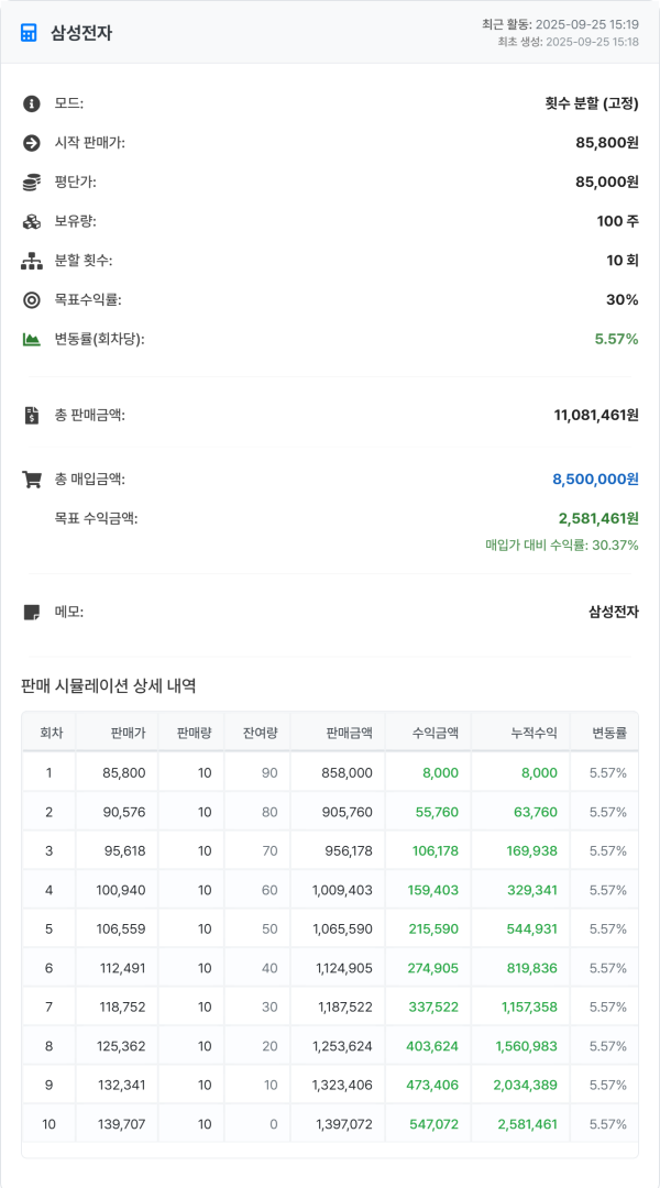 솔직히 처음에는 '분할 매도'가 좀 어렵고 귀찮게 느껴졌어요. 언제 얼마나 팔아야 할지 감도 잘 안 오고요. 그런데 이 계산기를 사용하니 복잡한 계산 없이도 체계적인 매도 계획을 세울 수 있었습니다. 특히 '횟수 분할 ' 모드를 선택하니, 제가 정한 횟수에 맞춰 매도 목표가와 예상 수익을 한눈에 보여줘서 정말 편리했어요.