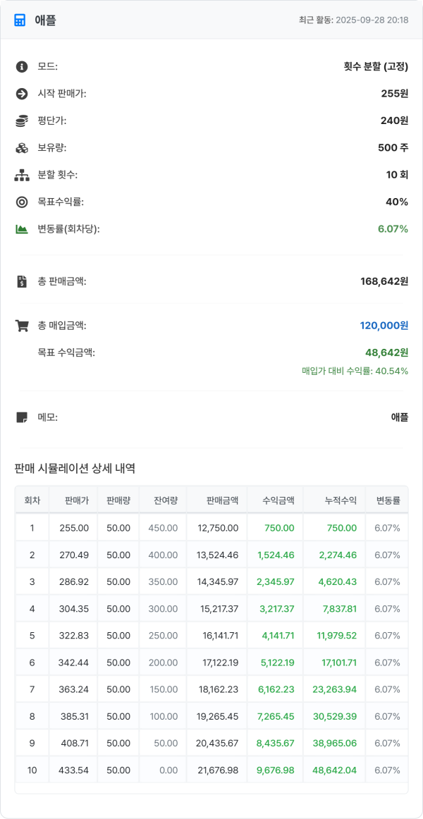 와, 이 웹사이트 분할 계산기 써보고 애플 목표 수익률 40% 계산해봤는데 소름돋네요!